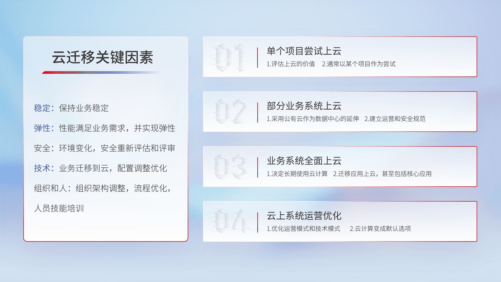 结合实际业务,,,,从规划设计、、、云平台选型、、、云原生改造、、、数据迁移、、集成交付,,,,迁移全过程为客户识别最佳上云路径,,做好风险识别管理,,设计网络架构、、身份权限、、安全审计合规、、操作审计、、日志审计、、监控告警策略、、、多站点容灾设计等,,,,对云上基础设施进行整体规划,,提升IT治理水平,,,以满足弹性、、高可用、、、高性能的需求。。。。